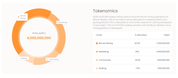 $BTCMTX代幣是一種ERC-20代幣,總供應量為40億,以支援Bitcoin Minetrix平臺上的質押機制。