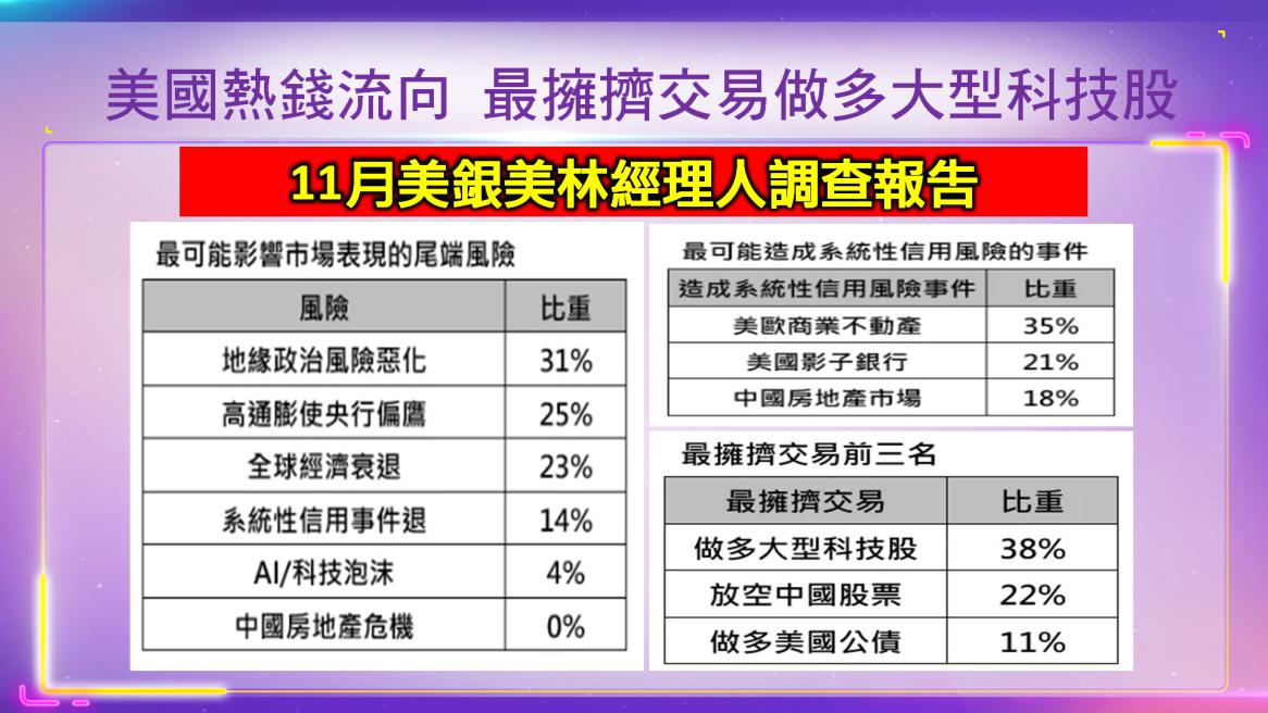 11月美銀美林經理人調查報告:全球大型基金操盤手大幅加碼債券,對債券的配置大幅提升至淨19%加碼。自2009年3月以來最高,54%的經理人認為2024年債券的表現將居冠,遠高於股票的29%;但本月對股票佈局,從原本淨4%減碼,攀升至淨2%的加碼,是自2022年4月以來首次轉為加碼。