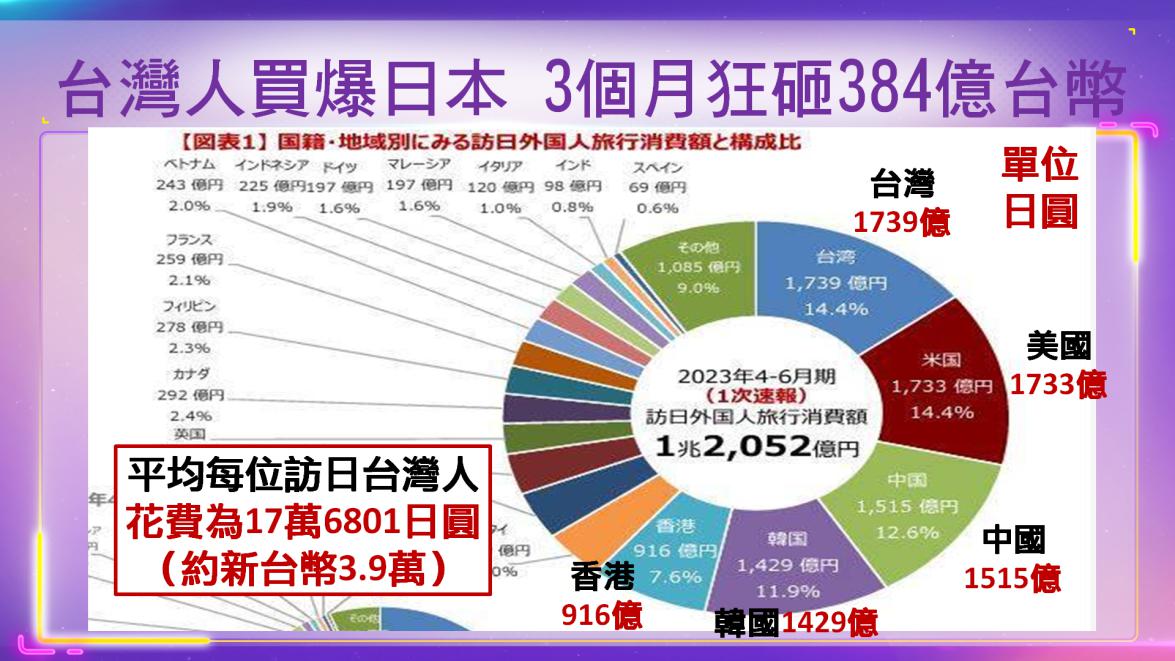 日本官方統計,2023年6月訪日外國旅客估計突破200萬人,訪日旅客最多的為南韓55萬人,其次為台灣39萬人、美國23萬人,台灣訪日遊客數量也許不是最多,但台灣人訪日的消費力卻是全球第一;2023年4月到6月台灣人在日本花了新台幣384億元,擊敗美國、南韓等各國觀光客。
