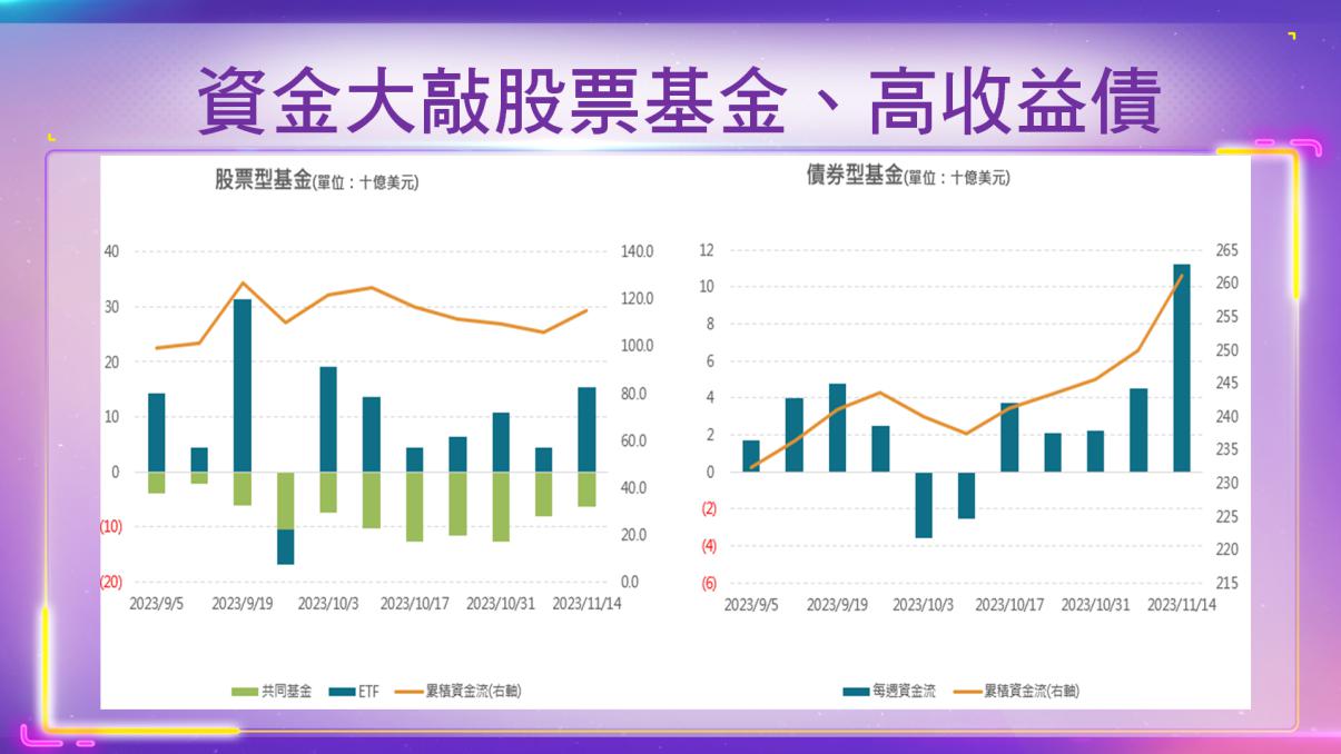 截至11/15當週,投資人大敲全球股票基金114.8億美元,創6月14日當週以來最大買超金額。其中光是美國股票基金的買超金額就達93.3億美元,遠高於前週買超量18.4億美元,觀察各類股資金流向,買超冠軍為科技股基金,在此期間大舉吸金21.5億美元,創2021/12/15當週以來新高。全球債券基金也保持買超態勢,獲資金淨流入35億美元,呈現連二買。