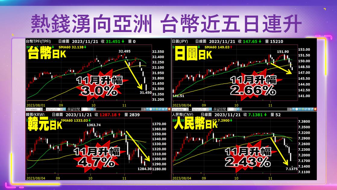 市場研判聯準會升息循環告終,2024年大幅降息,激勵熱錢持續流入台灣,新台幣匯率20223/11/20勁升1.98角,收31.658元,連六升並創逾三個半月新高,累計升幅高達6.94角。匯銀主管指出:熱錢連日來湧入台灣等亞洲新興市場,新台幣匯率連六天以來,升值幅度高達2.19%,超越台灣主要貿易對手國貨幣韓元、日圓、人民幣與星元,登上「最強亞幣」寶座。