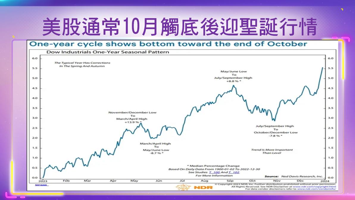 Business Insider 24日報導,統計1900~2022年道瓊工業平均指數每年的百分比變化中值後發現,道瓊一般都會在10月底左右觸底、於年底迎來上漲行情。2023年似乎與季節性趨勢差不多。歷史上,道瓊自7~9月高點拉回、至10月底的跌幅中值約為8%,而2023年道瓊自7月底高峰起算、至10月24日為止已下挫近7%。報告稱10月的最後一週,股市通常會從季節性的疲軟走勢轉入牛氣最沖天的兩個月。投資人最好能變得更悲觀、股市面臨進一步超賣,才有機會啟動年底多頭行情。