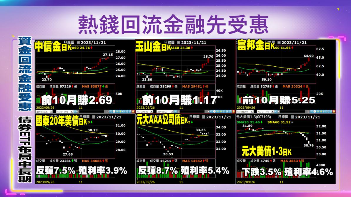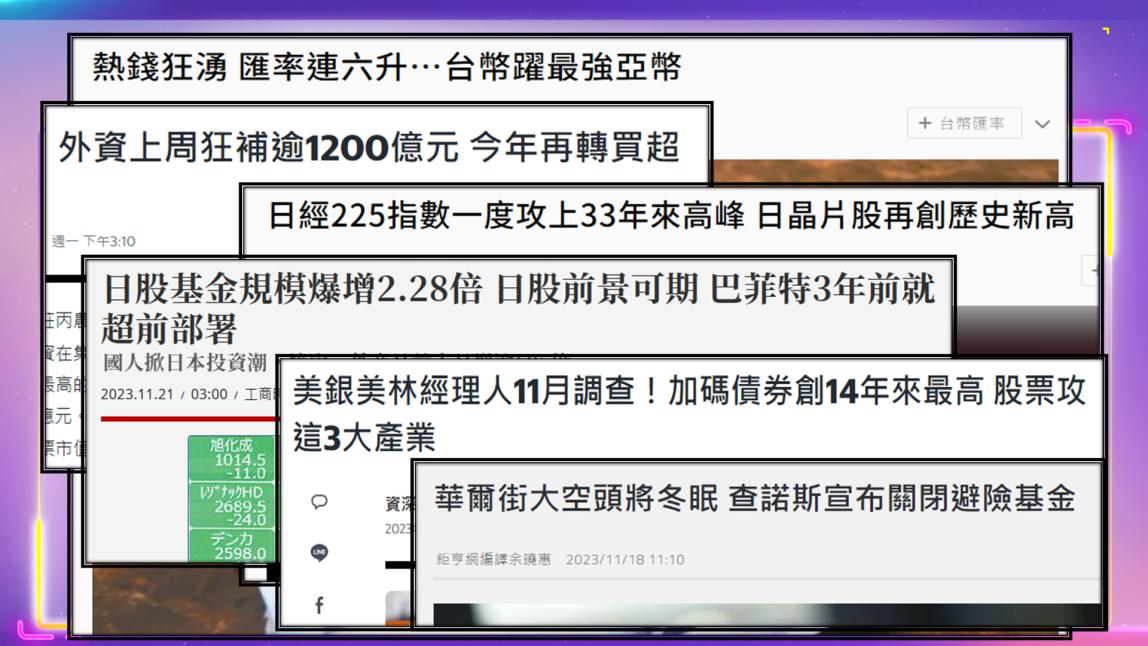 大家好,我是興哥。這一波台股的上漲已經超過了1000點。而一萬七千點站上之後,目前看到熱錢持續湧進,台幣從32.6強升到31.3元,可見的資金持續的流入,包含了台股的大漲、台積電的買超都屬於外資補買、認錯行情的動作。除此之外我們看到,日本的股市也是一樣,這一波大漲過程中,今年大漲28%左右。台股相關的日本ETF,三檔通通也是有跟上漲幅。而操作日股最神也最厲害的、莫過於股神巴菲特,因為他借了日圓,發了日圓債,避開了匯率的波動損失,且持續加碼五大商社。我們看到日股應該還有一段空間可以來做期待。最後回到美國,美國的部分,目前看到資金是買進基金跟高收益債,因為高收益債目前看來明年的漲幅會比今年大。因此短線回到台灣,回流的資金受惠到金融股,而我們之前提到的所謂長期的債券:包含美國公債和公司債等等,這一波反彈的空間已來到7個點至8個點,接下來往上墊高的機會有,不過還是以高債息為主,來做這樣的觀察。興哥抖音