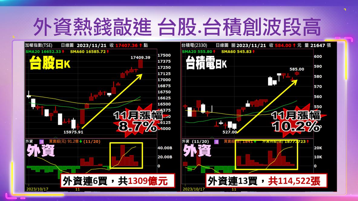 台股上周大漲3.15%,外資大舉回補,根據台灣證券交易所統計,上周外資在集中市場買超1218.00億元,超過2023年2月第一周的1,195.46億元,創下2023年以來單周買超最高的一周。此外,上周千億元買超,為2023年以來原本累計賣超金額一舉轉為買超105.84億元。個股買賣超部分,買超集中在晶圓雙雄、面板及金融股,買超聯電79781張、台積電66442張。