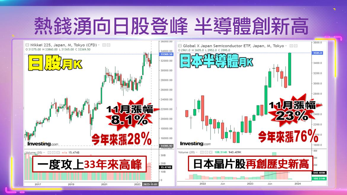 2023/11/20日經225指數,一度突破2023年6月盤中高點,達到33年來最高水準,隨後轉為小跌,日本半導體股則再創歷史新高。2023年日經225指數已上漲29%,日圓疲軟、企業獲利穩健以及東京證交所推動公司治理改革,都成了日股的利多。FactSet日本半導體指數,周一最高上漲0.9%,再創歷史最高水準。