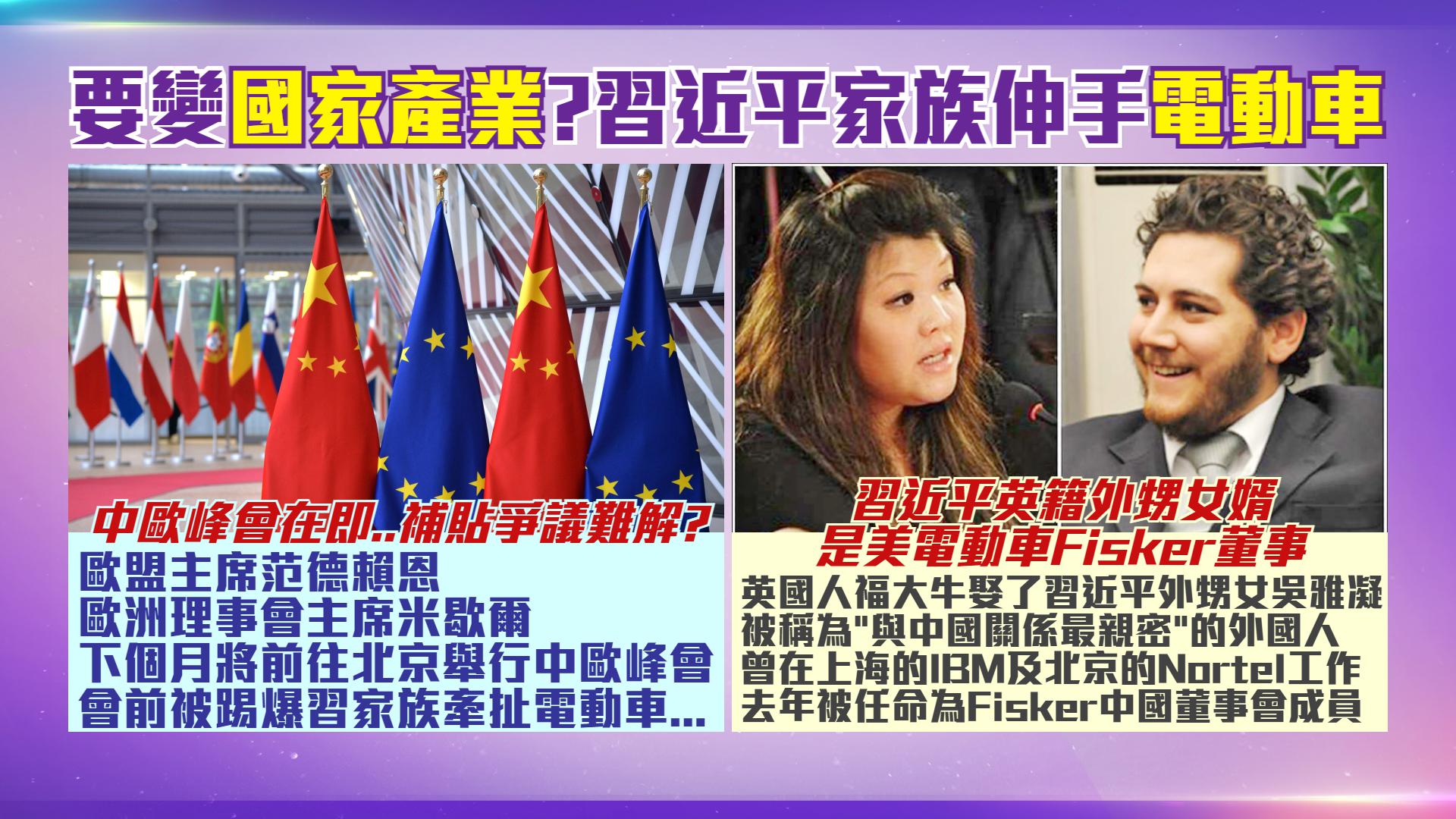 歐盟委員會主席范德賴恩和歐洲理事會主席:米歇爾下個月將前往北京,與中國領導人舉行中歐峰會;外界對中歐峰會可能取得成果的期待已降至最低,而歐盟執委會主席:馮德萊恩日前對中國的雙邊貿易關係表達強烈不滿,尤其是中方對電動車業不公平補貼;因為會前被踢爆,習近平的家族竟然參與擴展中國的電動車產業,並且從政府補貼以及建造新的電動車廠中獲利