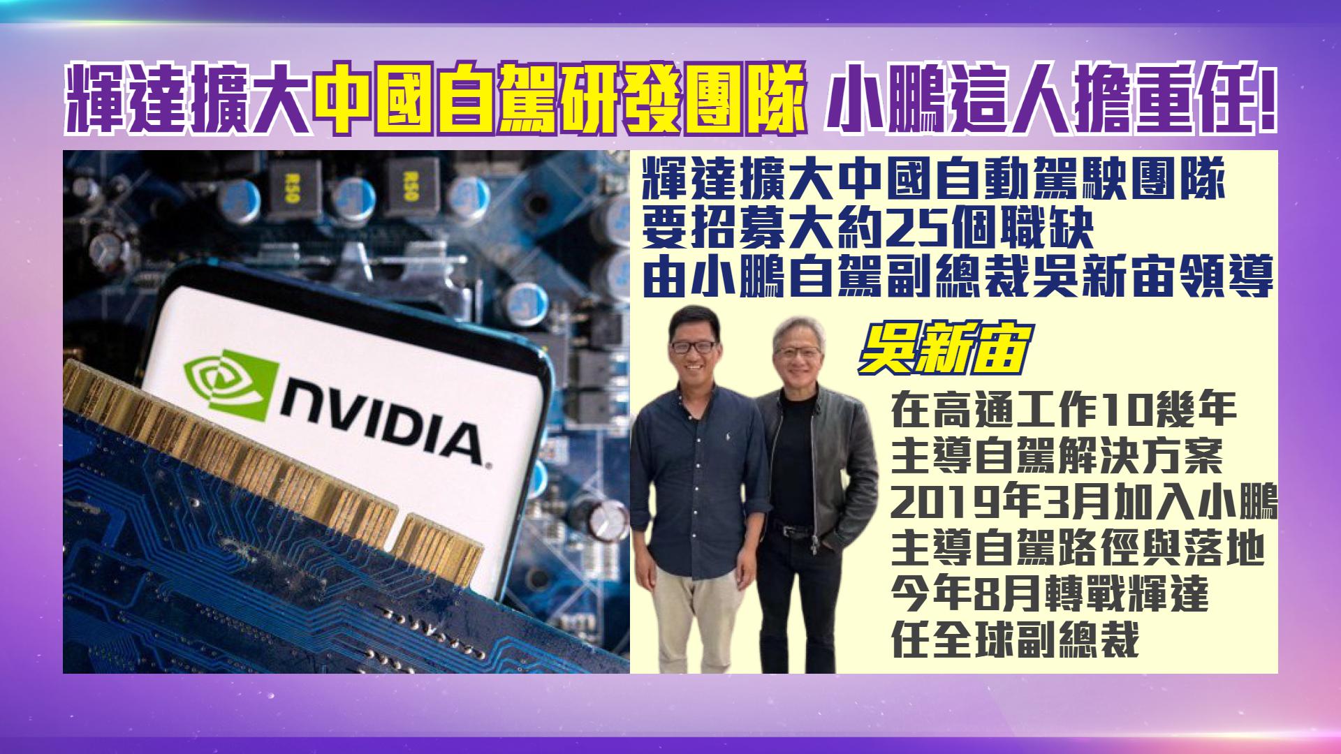小鵬汽車自動駕駛「頭號人物」、自動駕駛中心副總裁吳新宙-2023年8月轉戰輝達,擔任全球副總裁職務,掌管自動駕駛軟體業務。