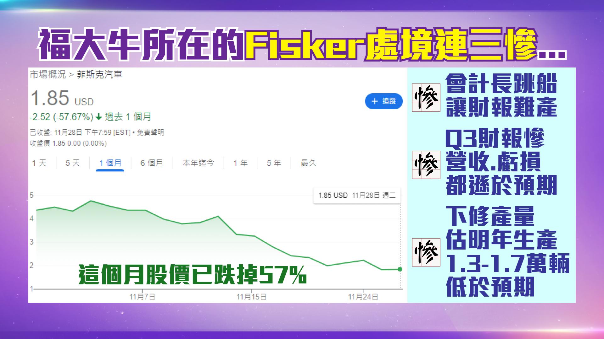 美國電動車新創公司Fisker2023/11/8公布最新財報,突然臨陣延期,原因在Fisker會計長閃辭,「新任會計長於2023/11/6生效就任,原任會計長已於2023/10/27解任,造成財報及相關財務揭露的編製進度延遲。」