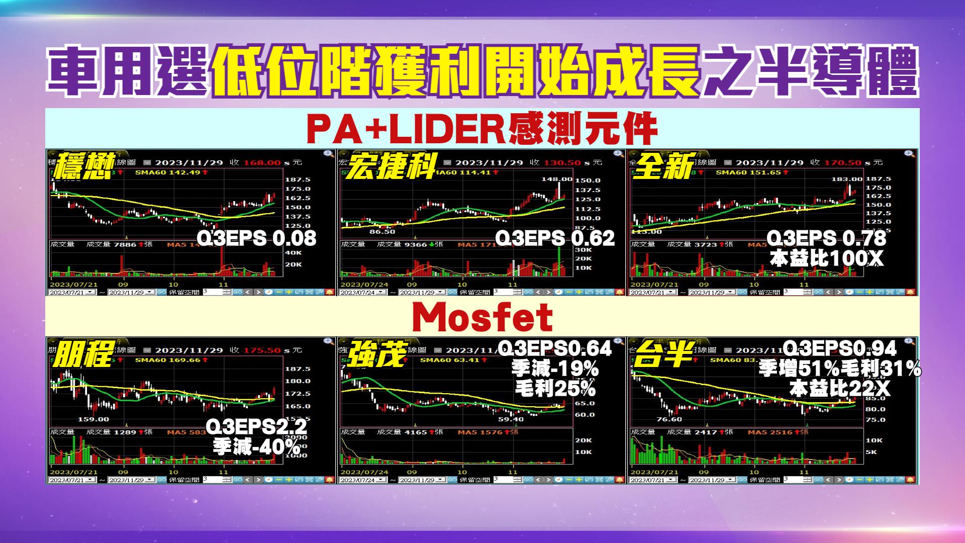 大家好,我是興哥。消費電子崛起,那麼電動車這一塊機會到底在哪裡?我們從中國市場來看,整體新能源車的銷售量是持續再創高。不過其中的眉角、貓立在那裡呢?就是你要有關係。舉個例子來說:習近平家族包含他的外甥女婿,就拿到美國新創公司Fisker,這家公司在中國的董事會,所以他就可以怎麼樣!就可以拿補貼、拿關稅優惠;然而在中國近內的車市怎麼辦呢?那只好找國營、黨營的企業-華為來組大聯盟,所以現在變成兩塊都在互相得比拚。因此我認為現在的品牌獲利不易,應該還是要從元件來下手。最近漲得比較多的是PA放大器和Lider的元件。我的看法是不要去追高,但我目前看到的低基期準備齊漲的包括Mosfet的車用功率元件:朋程、強茂、台半等等,其實他們都具備本益比相對低,但是開始獲利,而且獲利持續的拉高。尤其是台半Q3的EPS0.94,季增,而且本益比相對的低。所以剛發動的同時,都可以來做介入,我們認為這一波的Mosfet應該是落後補漲的重心。投資大小事,我來幫你試。