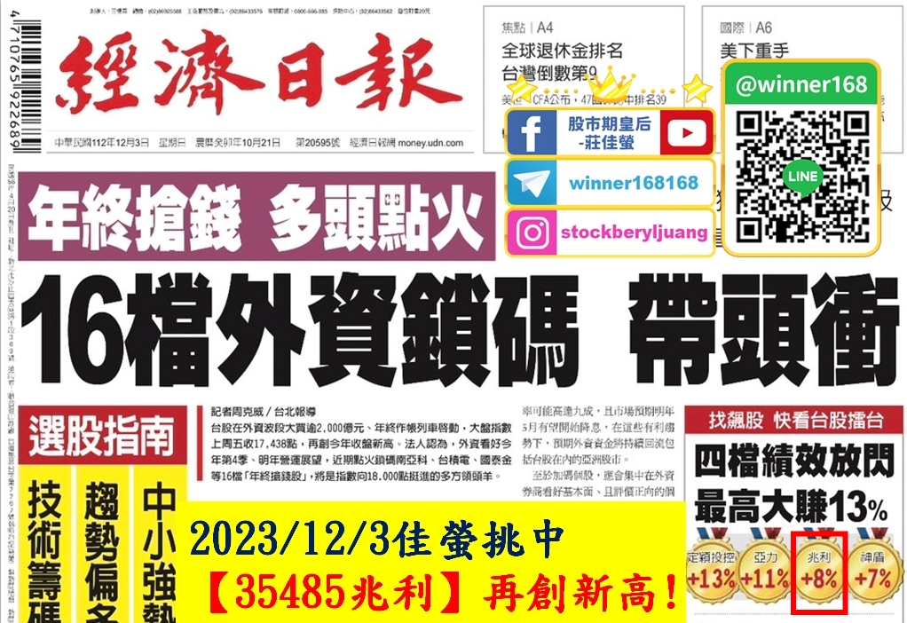 油價回落有利通膨降溫,聯準會12月有機會暫停升息,時序進入12月後,最關鍵的兩天,12月12日公布美國11月CPI數據、13日是今年最後一次FOMC會議,若都是正面發展,近期美元指數走貶,帶動新台幣匯率走升,資金面提供支撐力道,都有利於未來的行情。12月開始,集團作帳、作夢行情搭上選舉及元月效應四大行情啟動下,後市將會更加精彩可期。
