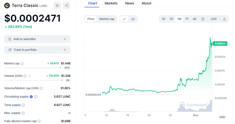 最近一周Terra代幣LUNC的價格表現突出,在24小時內漲幅高達30%,一周內累計漲幅更達到104%,成為市值前100名幣種中表現最好的。LUNC價格已經沖至近期高點0.0002471美元, 投資者持續看漲的勢頭。