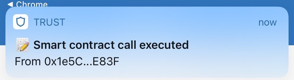 當點擊 Trust Wallet 中的“立即購買”時,將顯示“已執行智慧合約調用”消息,並在下一個螢幕上匯總詳細資訊 - 包括 Wall Street Memes Dapp (wallstmemes.com) 和網路費用。