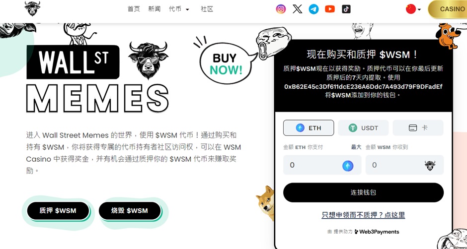 訪問官方網站wallstmemes.com(謹防經常冒充流行加密貨幣預售的假網站),然後按一下“連接錢包”。