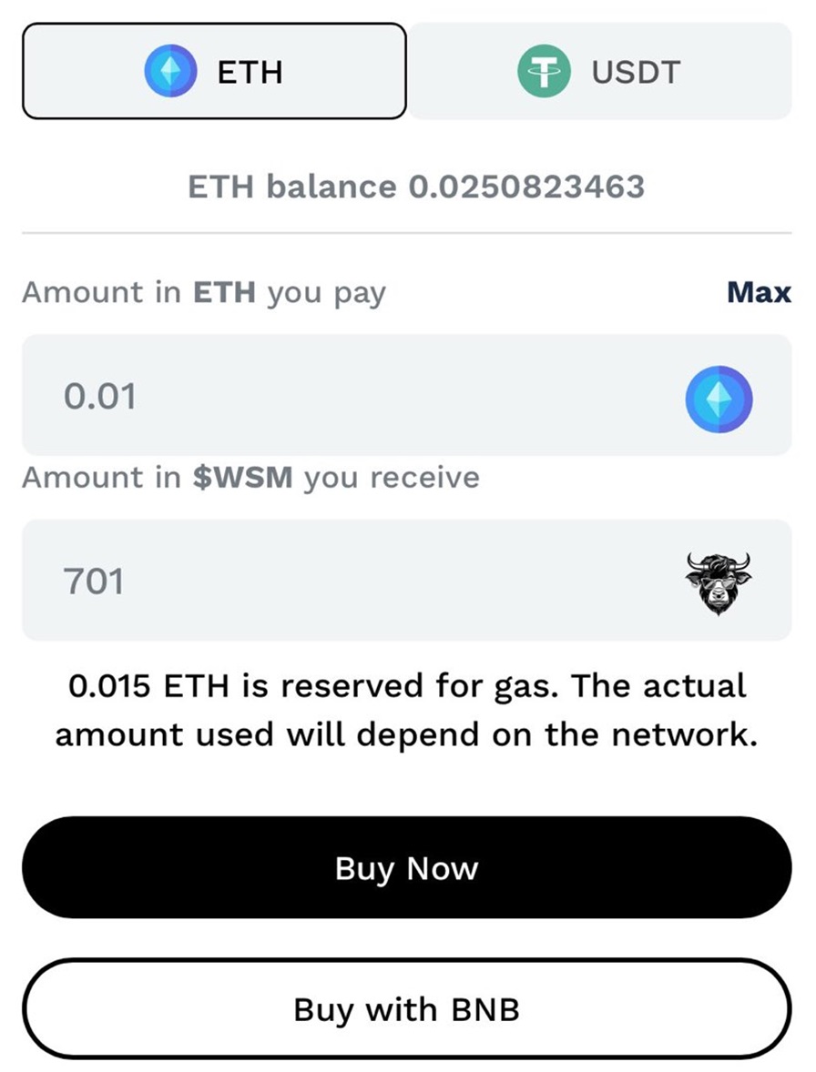 輸入 ETH、USDT 或 BNB 的金額以兌換 $WSM - 您將收到的金額會在確認買入訂單之前顯示。