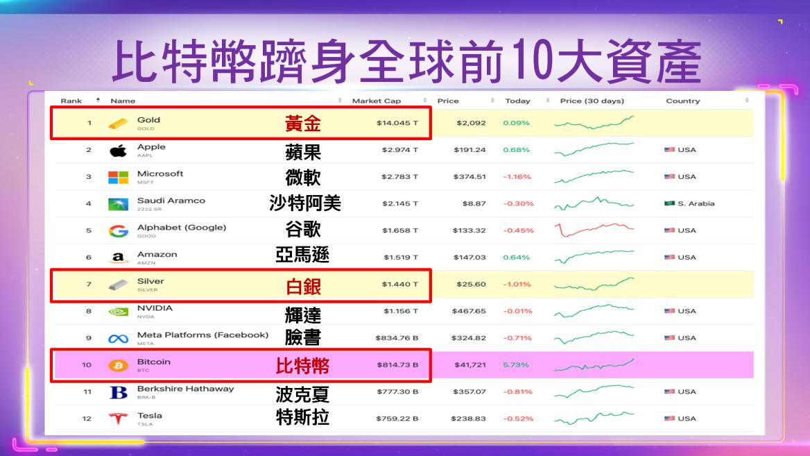 市值超越波克夏、特斯拉!比特幣躋身「全球 10 大資產」之列