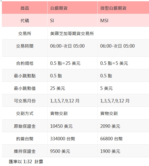 白銀期貨、微型白銀期貨的合約規格、交易時間、最小跳動點、保證金