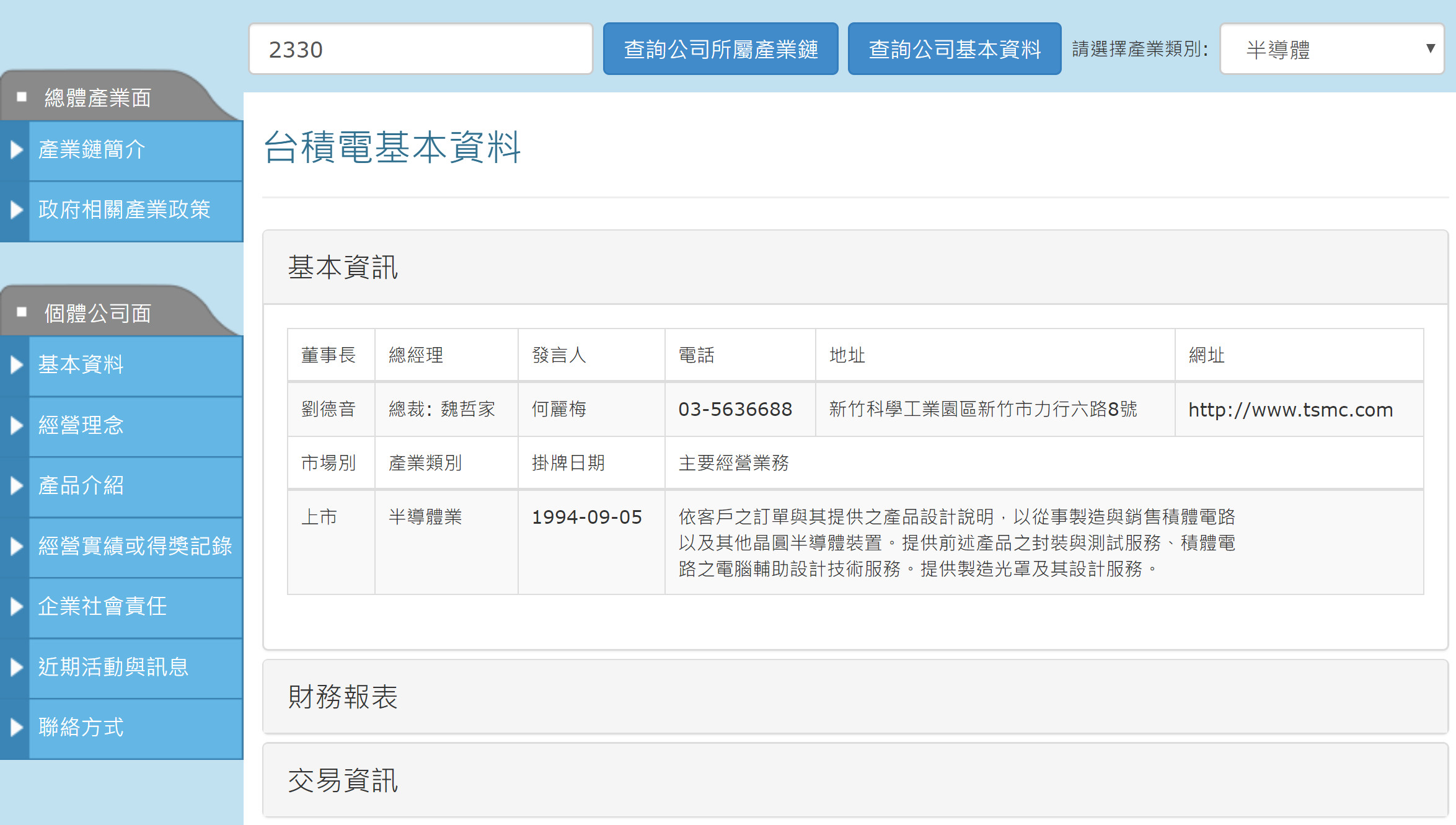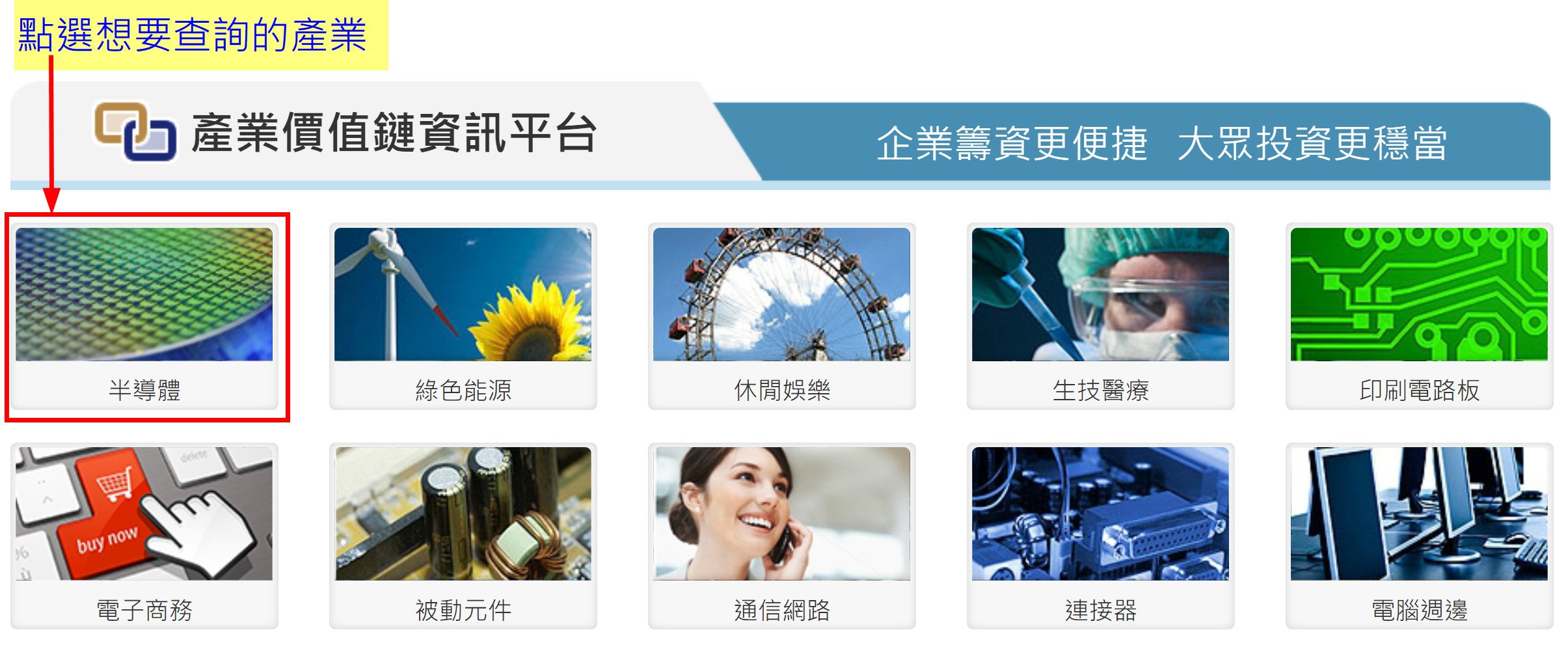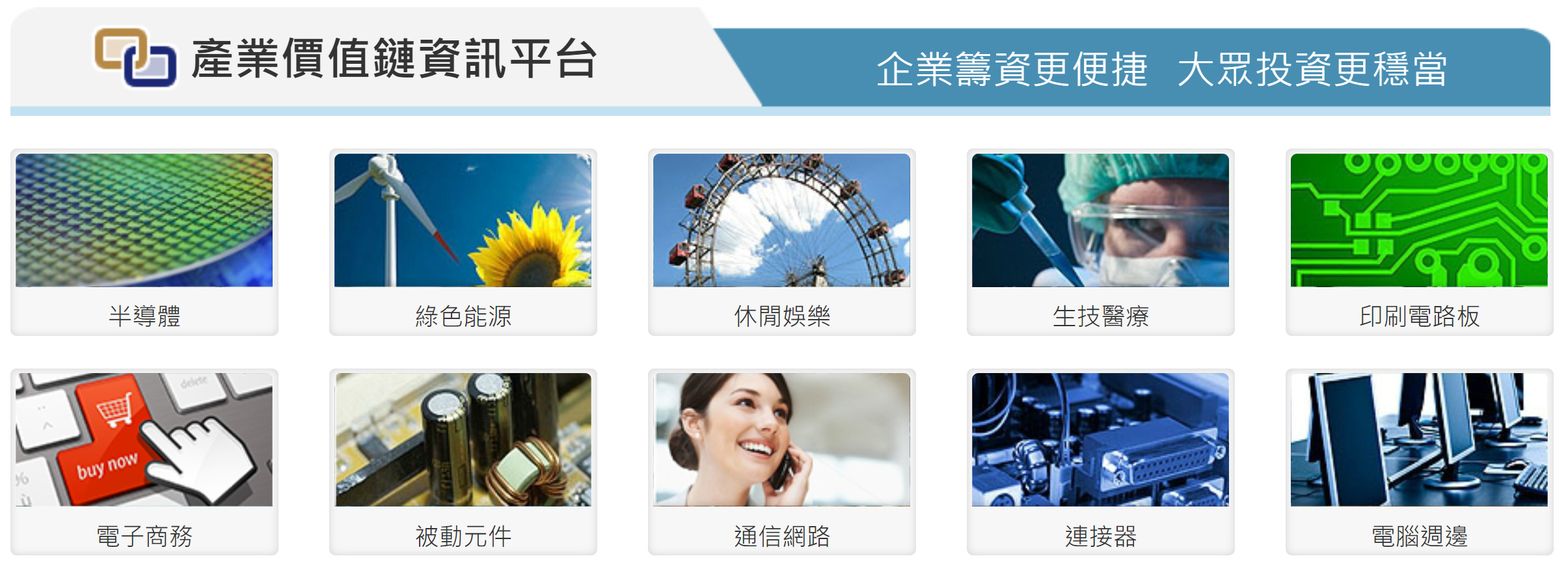此資訊平台涵蓋28大類產業,包括「生技醫療」、「綠色能源」、「休閒娛樂」、「半導體」、「能源元件」、「被動元件」、「通信網路」、「連接器」、「印刷電路板」、「電腦週邊」、「平面顯示器」、「觸控面版」、「水泥」、「食品」、「石化及塑橡膠」、「紡織」、「電機機械」、「造紙」、「鋼鐵」、「汽車」、「軟體服務」、「建材營造」、「交通運輸及航運」、「金融」、「貿易百貨」、「油電燃氣」、「文化創意」及「其他」類之上市、上櫃及興櫃公司;另產業價值鏈架構圖係標示公司所處產業鏈之上中下游,而非業務供應鏈關係。