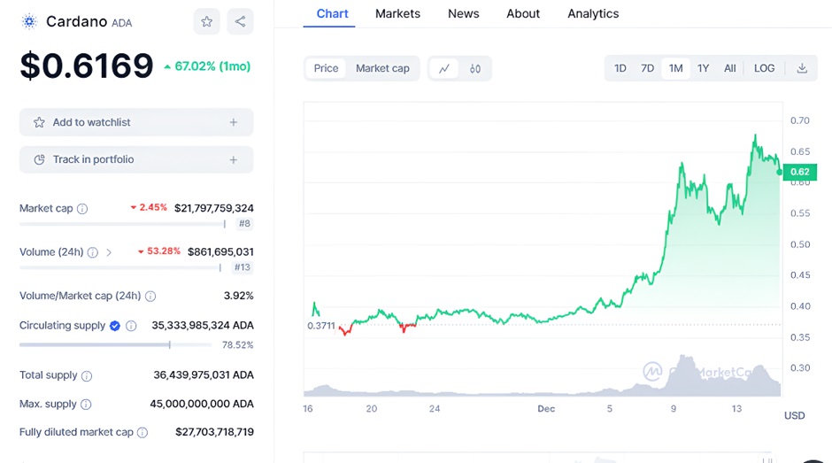 在比特幣今年上升到4.4萬美元高位加持下,加密貨幣Cardano(ADA)在過去一周價格強勢上漲43%,達到2022年5月以來的最高點0.64美元。 Cardano市值達到227億美元,與丹麥最大銀行丹斯克銀行的估值相當,本文將分析Cardano最近上漲的原因,可以助大家判斷後市前景。
