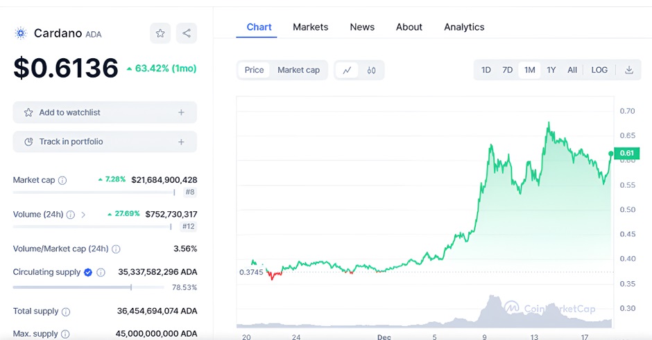 根據CoinMarketCap的資料,Cardano (ADA)的當前交易價格為0.6136美元。在過去24小時上升8%,但在過去7天增長11%,一個月激增64%。
