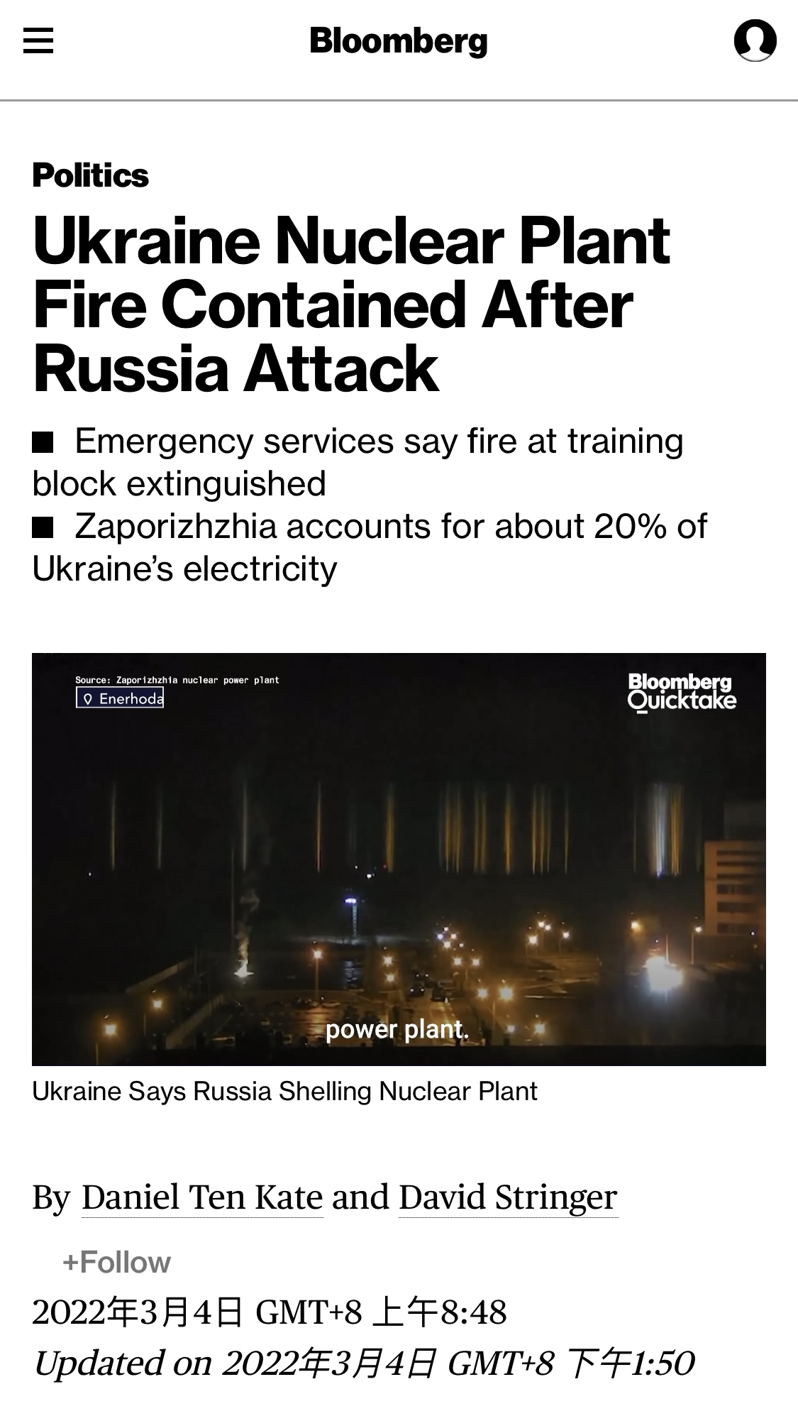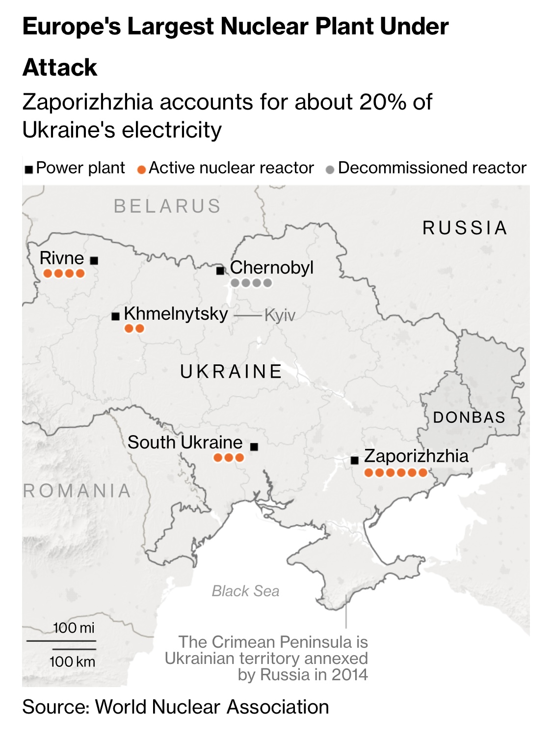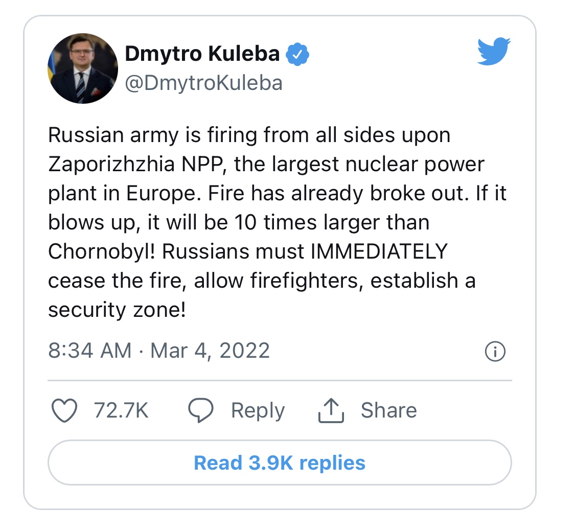 👉烏克蘭外交部長說,如果發生事故,是車諾比規模的10倍