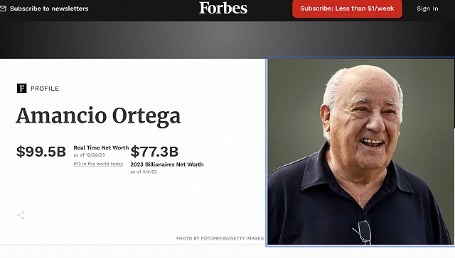 在《富比士》公佈的2023年財富成長最多的10位億萬富豪榜單中,Zara創辦人Amancio Ortega位列第六,其身家在2023年(統計截至12月15日)從642億美元成長至974億美元(約7,671億元)。Amancio Ortega是榜上唯一來自時尚零售業的富豪。截至26日,Amancio Ortega以995億美元在福布斯全球富豪榜上排名第13,並穩居西班牙首富地位。