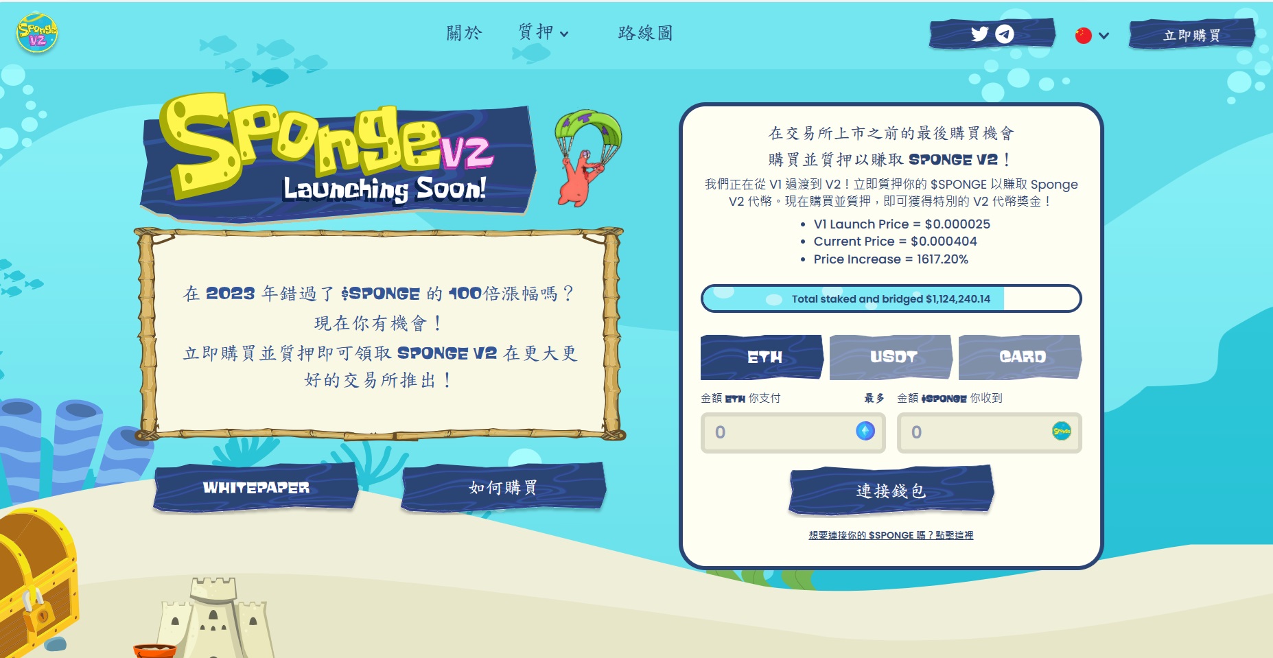 但這一次,它不僅僅是為了駕馭市場浪潮——Sponge V2 在其生態系統中引入了Play-to-Earn (P2E) 實用程式。使用Sponge.vip 上的小部件購買或質押$SPONGE 以獲得獎勵 V2 代幣,然後繼續質押你的 V1 Sponge 以賺取更多 Sponge V2。