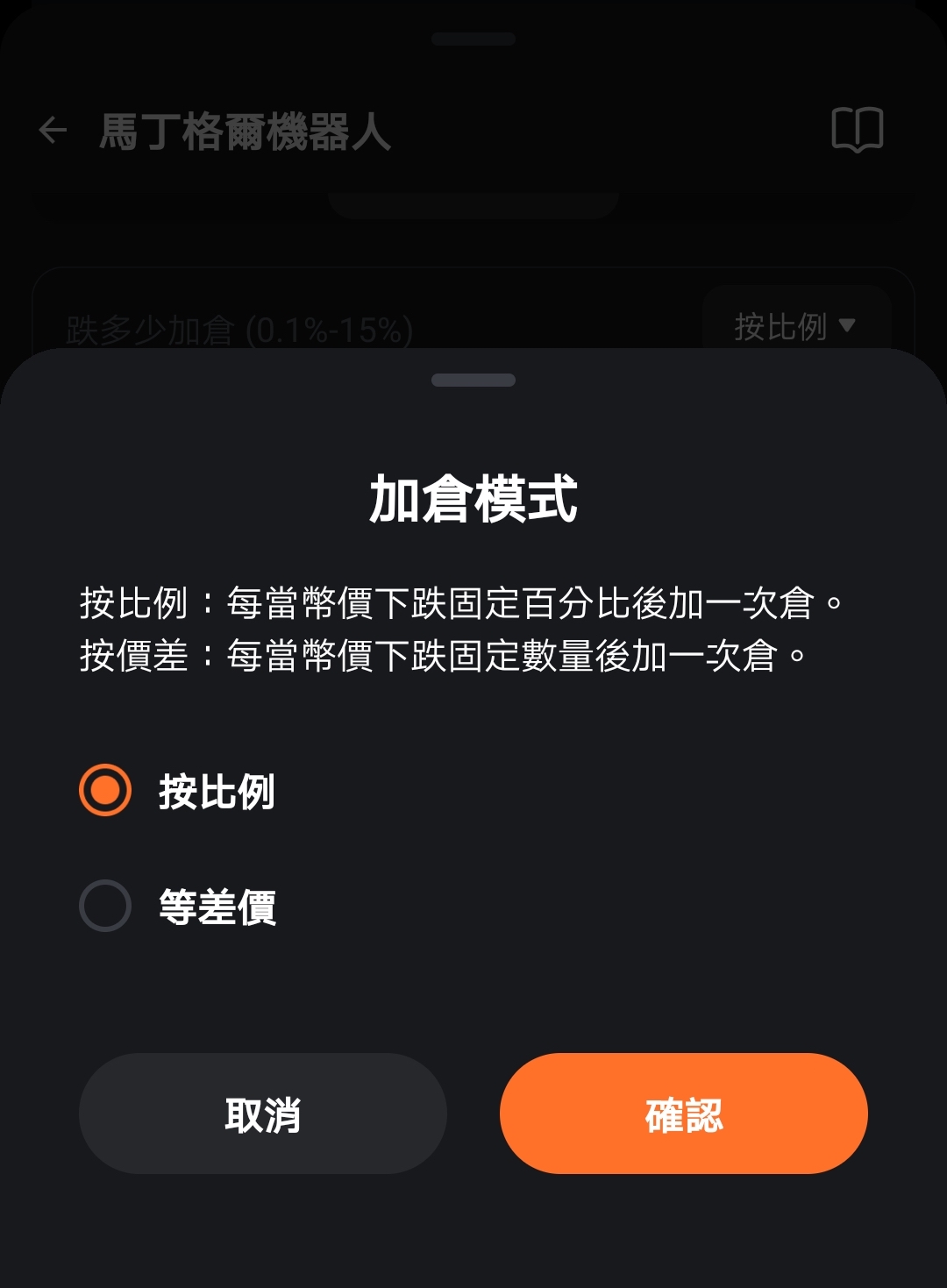最大加倉次數:每一個輪次中,把資金分成多少份分批抄底的份數。馬丁格爾機器人的每次的購買金額將以1、1、2、4、8、16、32…的序列來執行。
