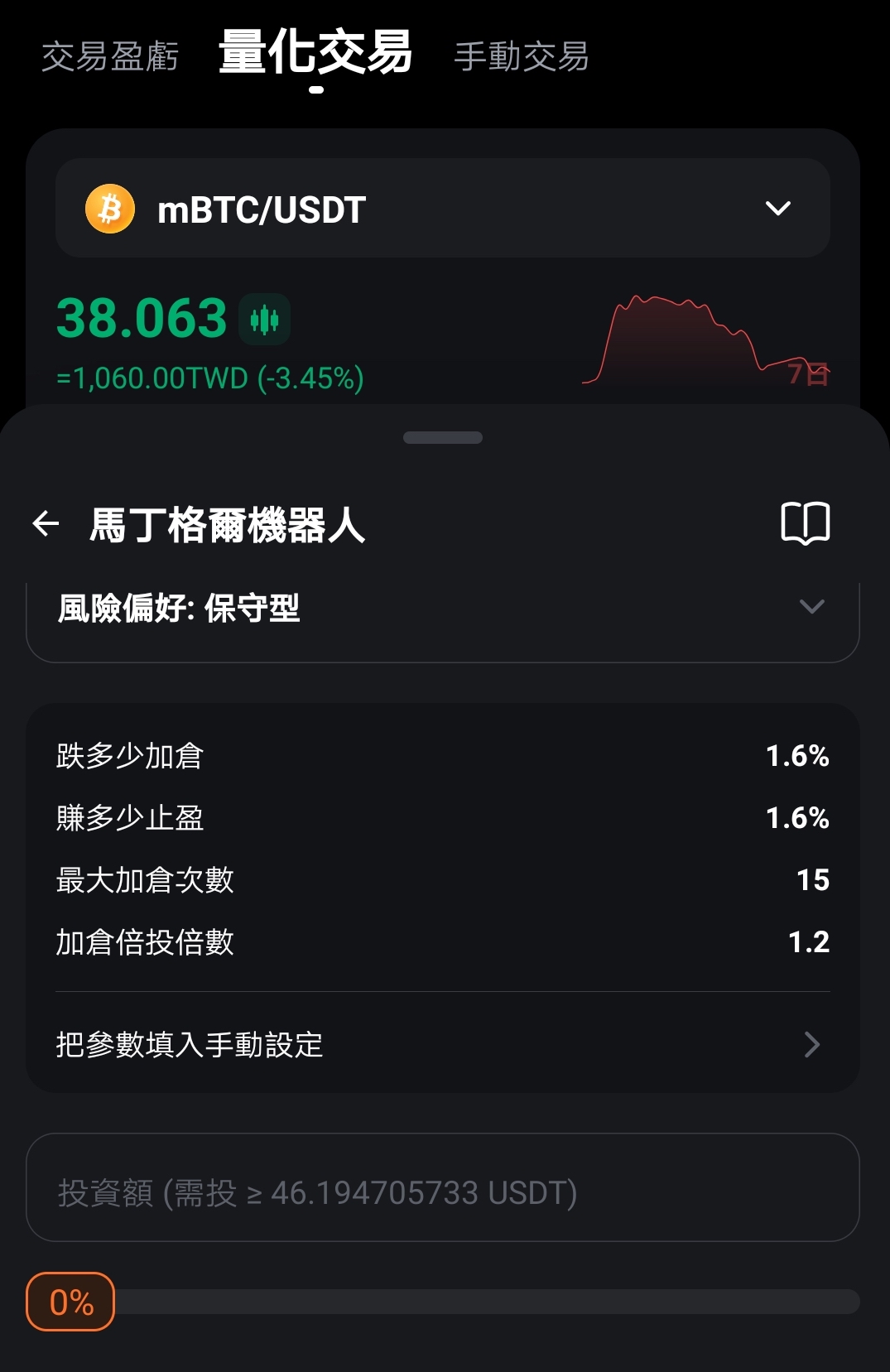 目前馬丁格爾的AI策略一共有兩種AI參數:一種是均衡型,每下跌1.6%補倉,每賺取1.6%止盈,最大加倉次數為8次,每次加倉倍投倍數是1.5倍;另外一種是保守型,每下跌1.6%補倉,每賺取1.6%止盈,最大加倉次數為15次,每次加倉倍投倍數是1.2倍。補倉或止盈的百分比每次可能都不同,AI會依照當時近期狀況自動調整,