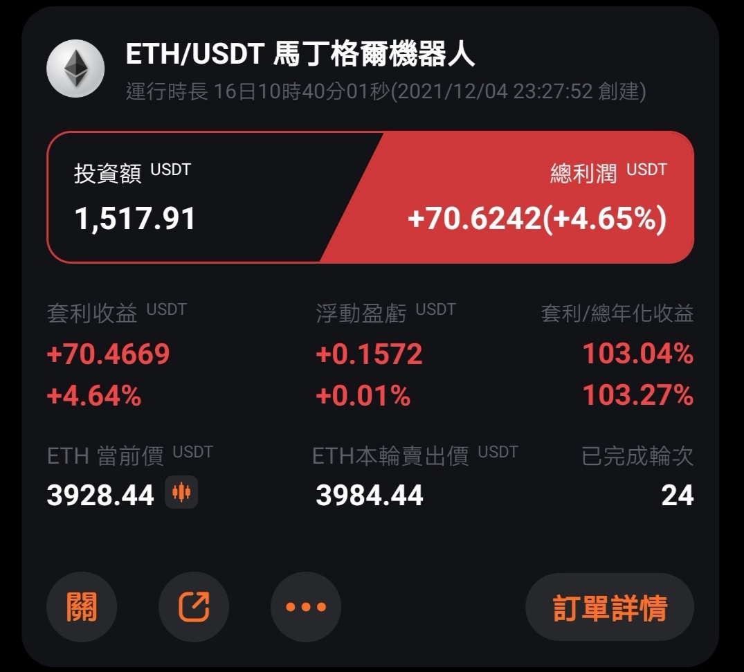 首先是最上面的投資額和總利潤,顯示了投入的總資金量,以及已經扣除了手續費之後的總利潤,即關單之後將會獲得投資額+總利潤的錢 (由於關單的時候行情也可能有波動,且會產生差價,因此關單後實際獲得的總數可能會與關單時顯示的有一些差別)