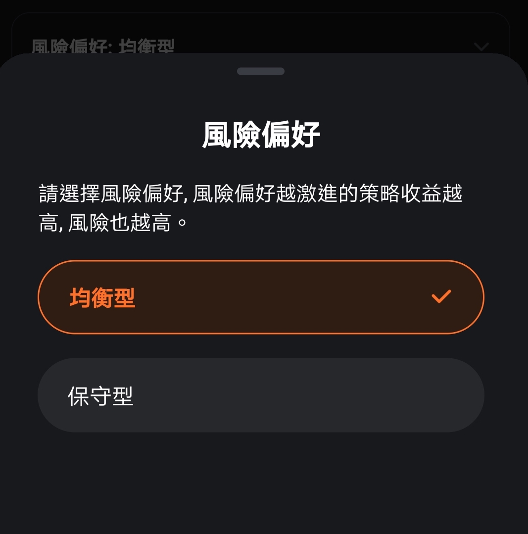 馬丁格爾機器人創建的方式有AI策略、手動設定和自由參數三種方式,AI策略有分為均衡型、保守型兩種,保守型可以降低策略的最大回撤,但收益可能也會略低,均衡型會讓收益和風險處於一個較為平衡的狀態。如果不知道怎麼設定,建議可以選擇保守型,比較不會有被套牢的風險