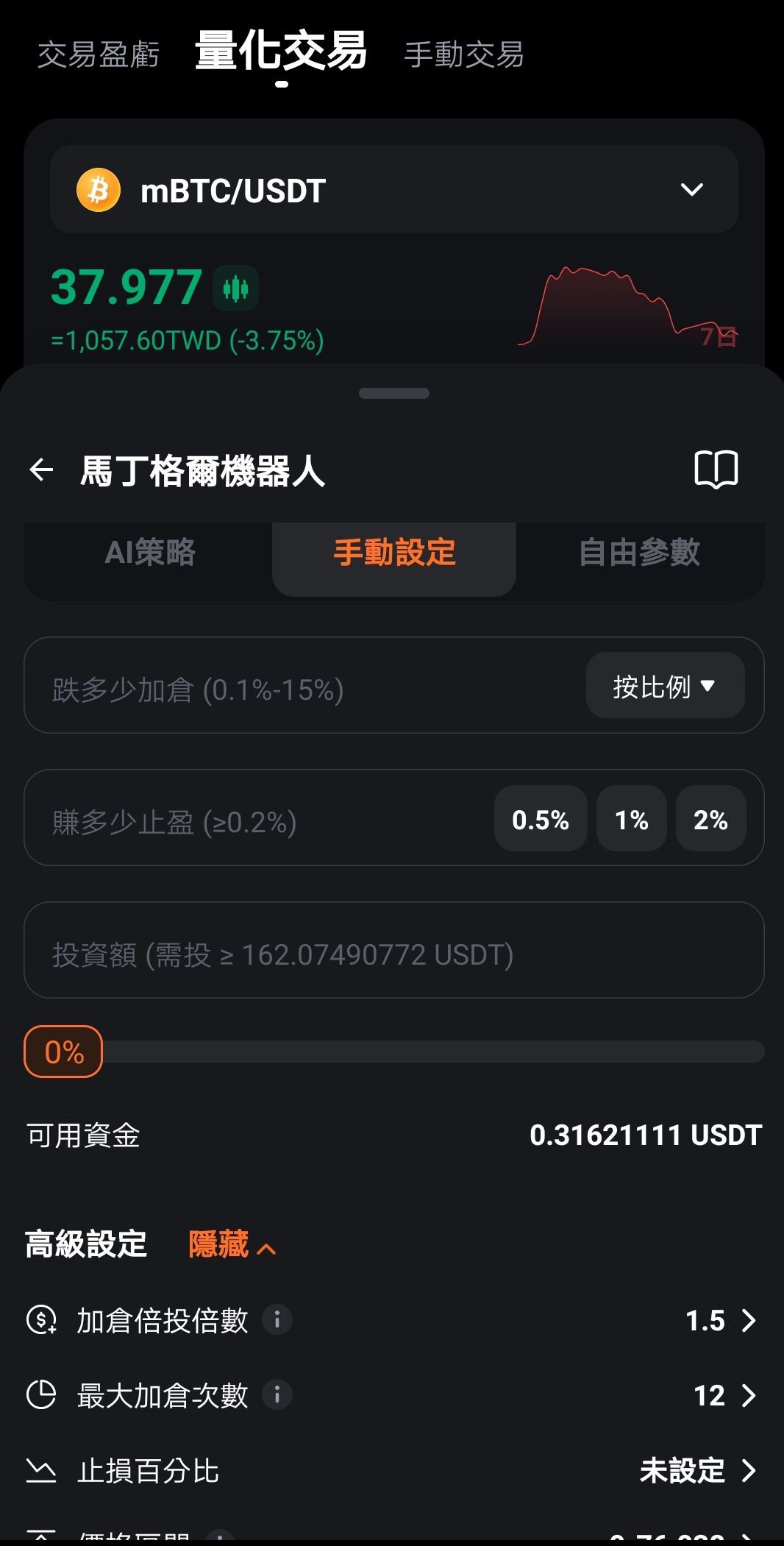 普通參數裡面一共有三個參數,分別是「跌多少加倉」、「賺多少止盈」、「投資額」,高級設定裡面是「加倉倍投倍數」、「最大加倉次數」、「止損百分比」、「價格區間」