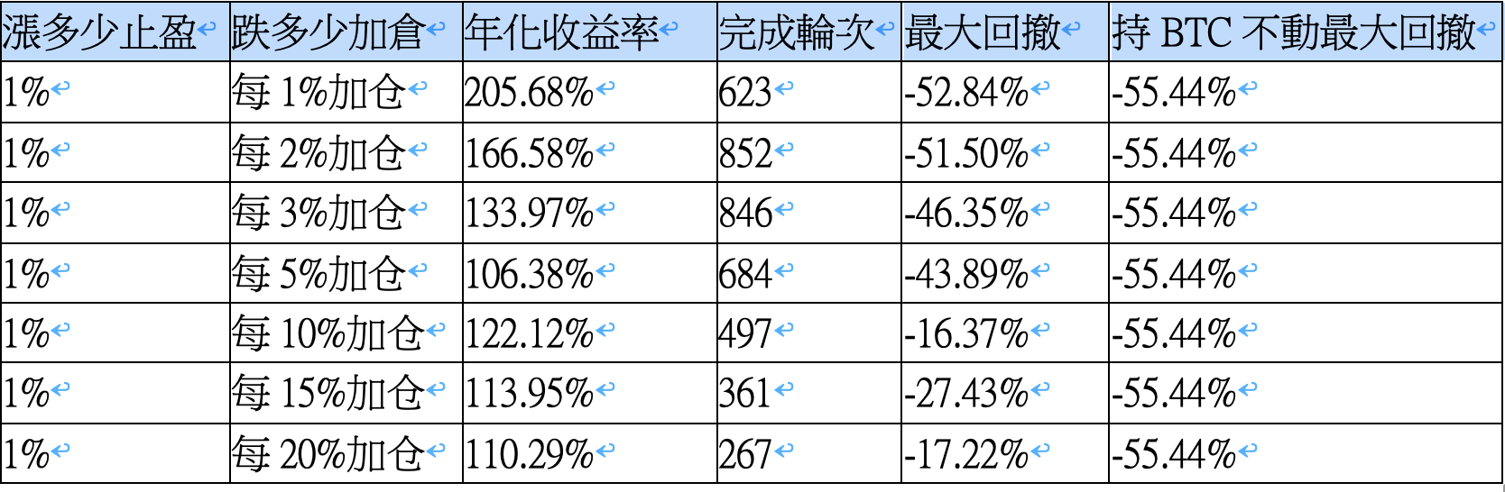 如果我們把策略變得更保守一些,增加跌多少加倉的百分比,馬丁格爾就可以獲得更穩健的收益,更小的回撤。從下面的表格看出來,如果每下跌1%加倉~每下跌2%加倉的年化報酬率較高,我們根據實際執行的經驗,也有了一個比較完美的兼顧報酬跟風險的參數,這漂亮的參數將在下一篇文章中跟大家分享!!