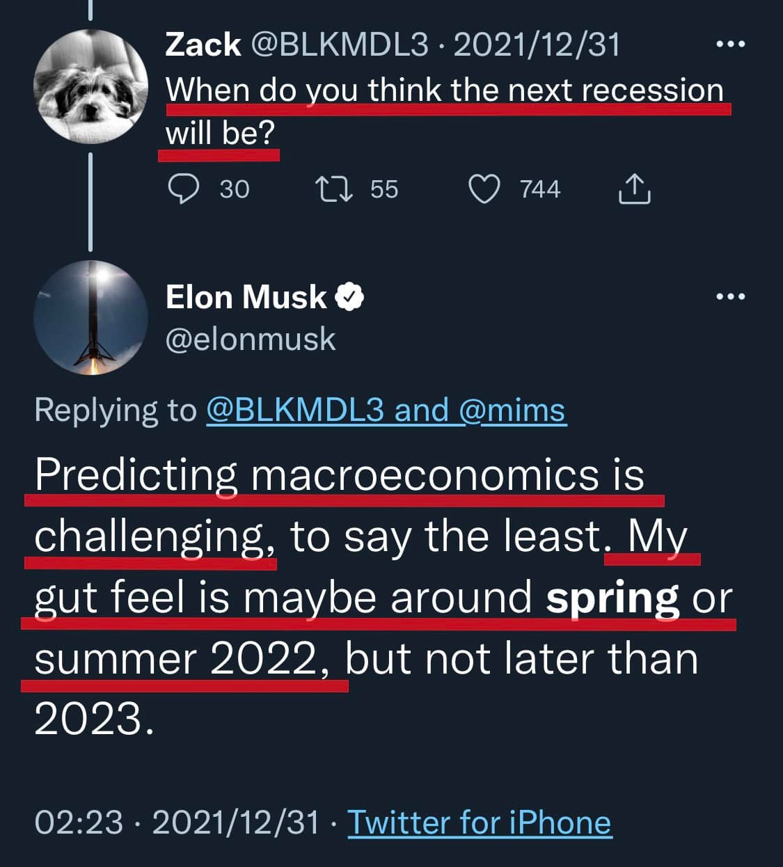 📌Elon Musk之前說預測總體經濟很困難,但預言最快今春看到