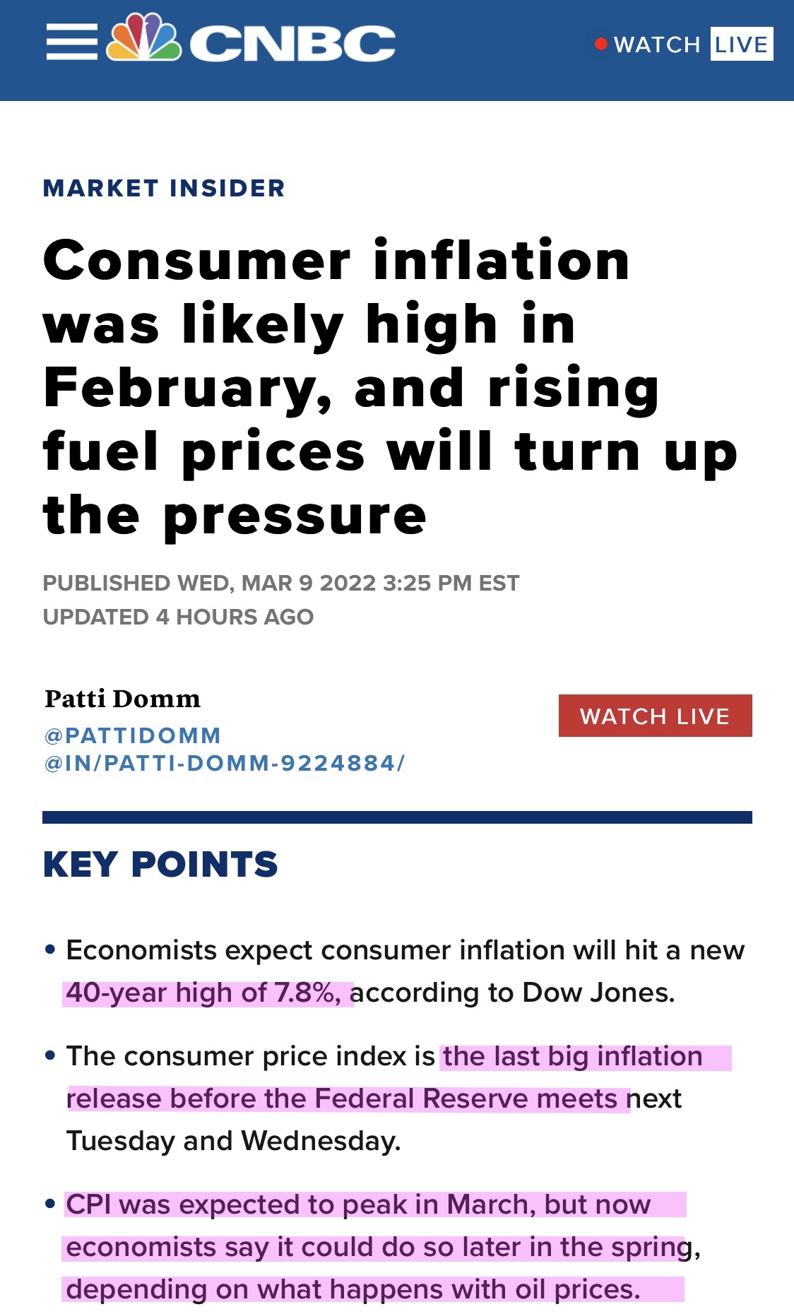 今晚盤前公布 #2月CPI通膨數據,預期 YoY 7.8% 、將再創40年來新高😵💫