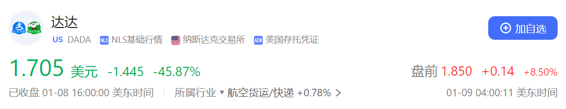 受此消息影响,达达美股出现暴跌。当地时间1月8日,达达股价接近腰斩,收盘报1.705美元,跌幅达45.87%。