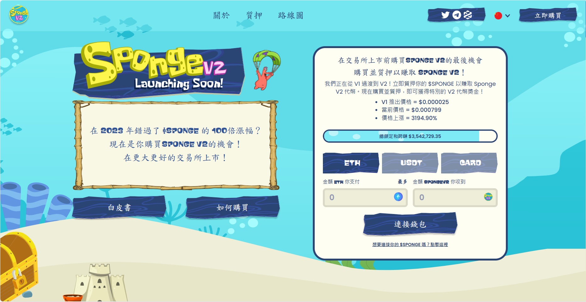 市場都概歎Sponge V1之成功故事將延續至V2之成功,Sponge V1乃2023年最大之模因幣,市值由百萬美金飆升至峰值十億美金,使先行投資者獲得千倍收益, 持有者過萬。