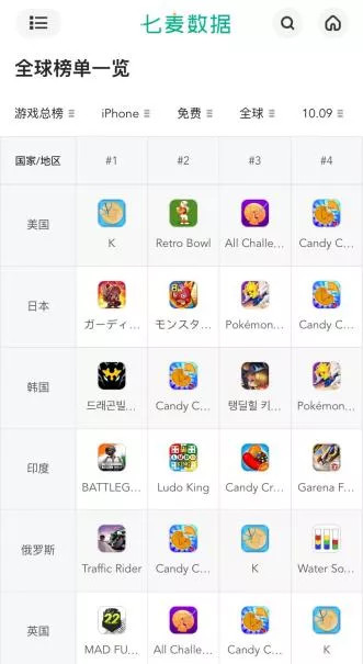 根據七麥數據檢測,在10月9日全球免費遊戲總榜中,Candy Challenge 3D、All Challenges-survival game、K-Games Challenge等與《魷魚遊戲》有關的遊戲産品,在美國、日本、韓國、俄羅斯、英國等多個國家或地區的遊戲榜單中位列前五。