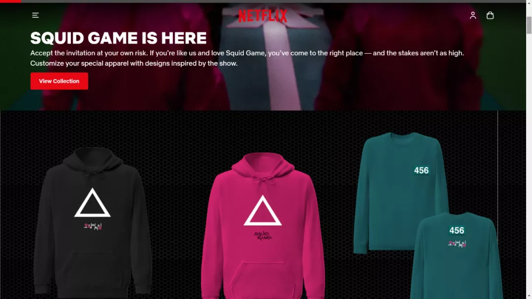 在奈飛旗下電商平臺Netflix Shop中,醒目的“SQUID GAME IS HERE”(魷魚遊戲在這裏)已然出現在網站首頁,而其售賣的周邊産品主要爲幾款帶有《魷魚遊戲》元素的T恤衫,售價在34.95美元至49.95美元之間。與第三方平臺相比,奈飛自身售賣的周邊産品無論是種類還是款式都不比第三平臺豐富,而那些在淘寶等電商平臺售賣的“同款周邊”顯然也並未獲得奈飛的正版授權。