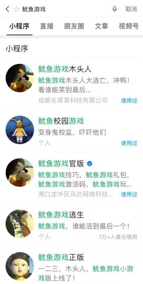 通過微信搜索發現,在微信小程序中已有近百款名稱中含有“魷魚遊戲”的小遊戲,其中部分小遊戲已有上萬人使用。