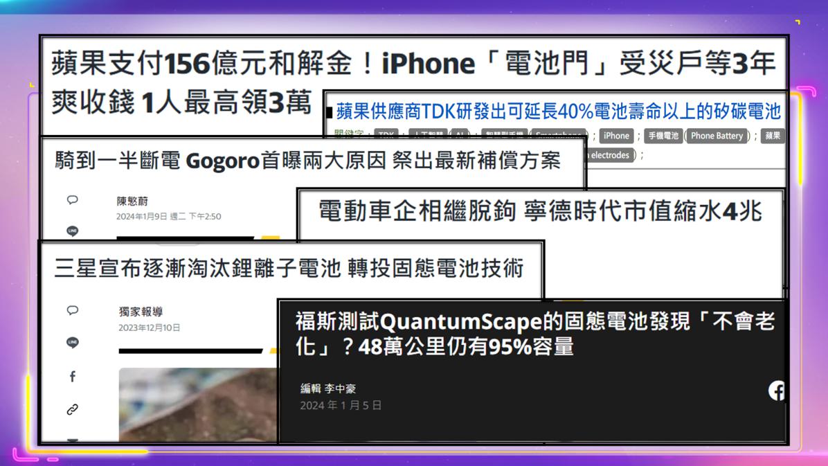 Gogoro「電池瘟疫」連連,不少車主反映電動機車電池品質不穩定,有斷電或耗電速度異常,甚至在行駛途中突斷電,以致遭追撞或自摔,車主卻只能在有問題的電池做記號,互助提醒。2023年11月至今,由車主自救逐一回報累積已達522筆。立委表示,Gogoro睿能公司的電池服務合約有免責條款,規定「除非法律不允許,否則不負品質保證的責任」,電池發生問題,業者可以完全不負責任,換電池就像賭博要看運氣。行政院回應,若涉及安全性的瑕疵,造成消費者生命健康損害,企業經營者不論有無過失,都應負賠償責任,且該業者的電池服務契約條款已抵觸《消保法》,應視為無效。