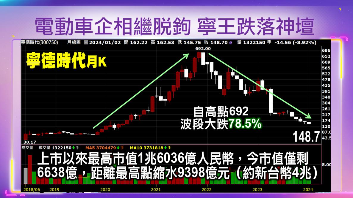 獨霸全球的中國電池製造大廠寧德時代2024年市占率雖提升,股價卻跌跌不休,從2021年12月3日,寧德時代股價創上市以來最高價692元,市值1兆6036億元人民幣,但今天報151.24元,市值僅剩6638億元,距離最高點縮水9398億元(約新台幣4兆元),主因是電動車企相繼脫鉤而去。