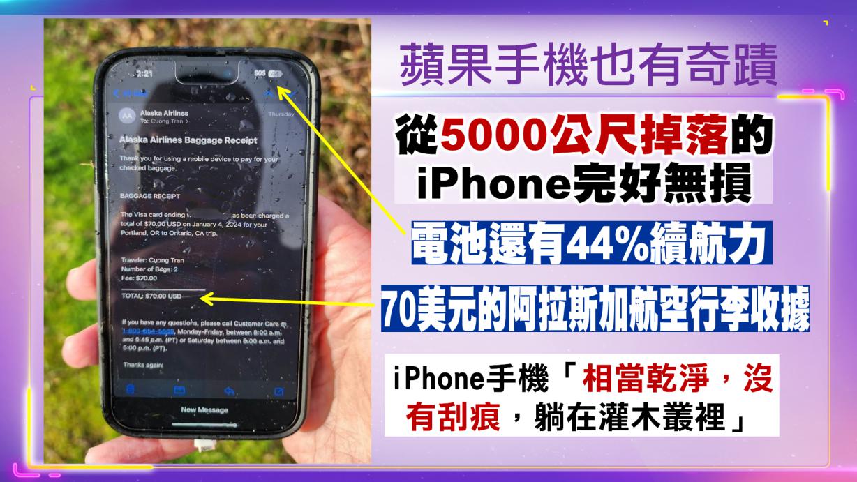 阿拉斯加航空近日發生客機在半空中掉艙門事件,一支iPhone手機從機上摔落約5000公尺後被人撿到,似乎就是乘客掉落的物品。根據上傳X平台的照片,iPhone螢幕似乎完好如初,以及電郵顯示70美元行李收據,電池還有44%電力,且手機仍處於飛航模式。而且手機相當乾淨,沒有刮痕,躺在灌木叢裡。