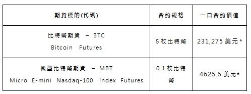 兩者交易項目都是 比特幣,微型比特幣期貨(MBT)的規格是比特幣期貨(BTC)的1/50。