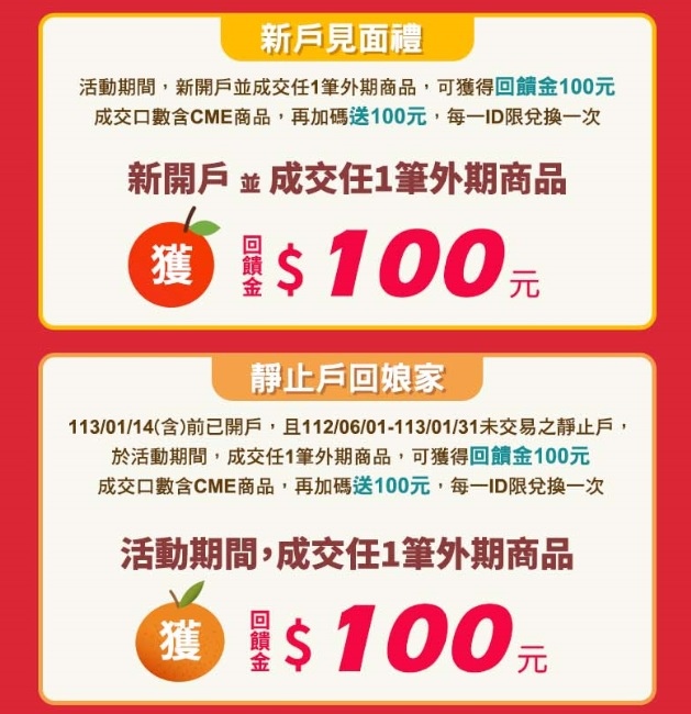 活動期間,新開戶並成交任1筆外期商品,可獲得回饋金100元