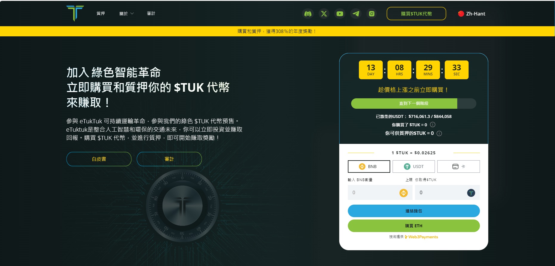 眾所周知目前有99%的人呼吸著污染的空氣(世衛組織),這是完全不能接受的。eTukTuk($TUK)是一種新興的綠色加密預售,旨在重新定義發展中國家的綠色交通環保。eTukTuk正在引領未來的交通邁出減少碳排放,消除與CO2相關的健康問題,並為發展中國家和全球提供財務包容的使命。