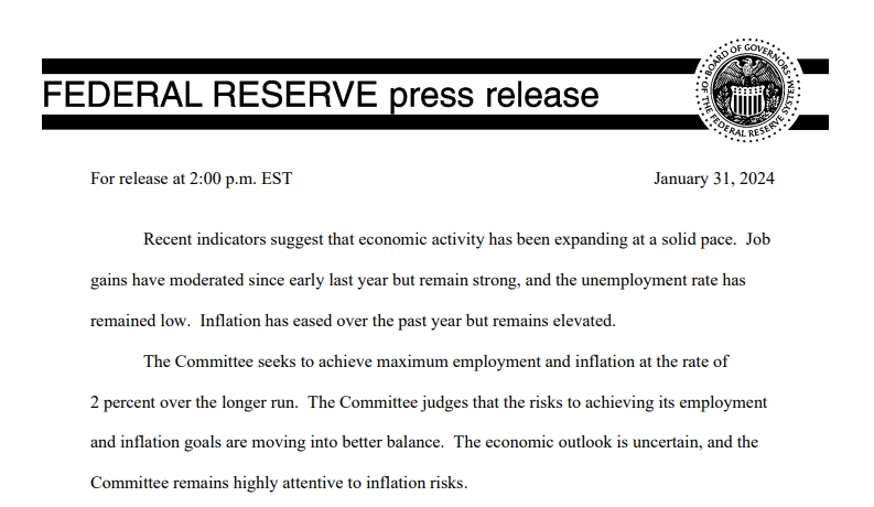 当地时间1月31日,美联储结束了为期两天的货币政策会议。毫无意外,美联储联邦公开市场委员会(FOMC)宣布,将联邦基金利率的目标区间维持在5.25%至5.50%不变,本次暂停加息的决策得到了FOMC投票委员全票赞成。