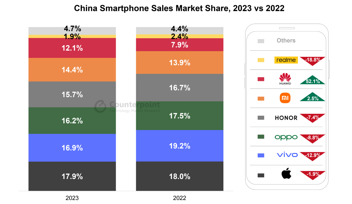 Counterpoint认为,这一最新数据说明华为正在强势回归中国市场。自从2019年受到美国制裁实施以来,华为的销售份额一直在下降,此次登顶标志着其首次重获冠军宝座。