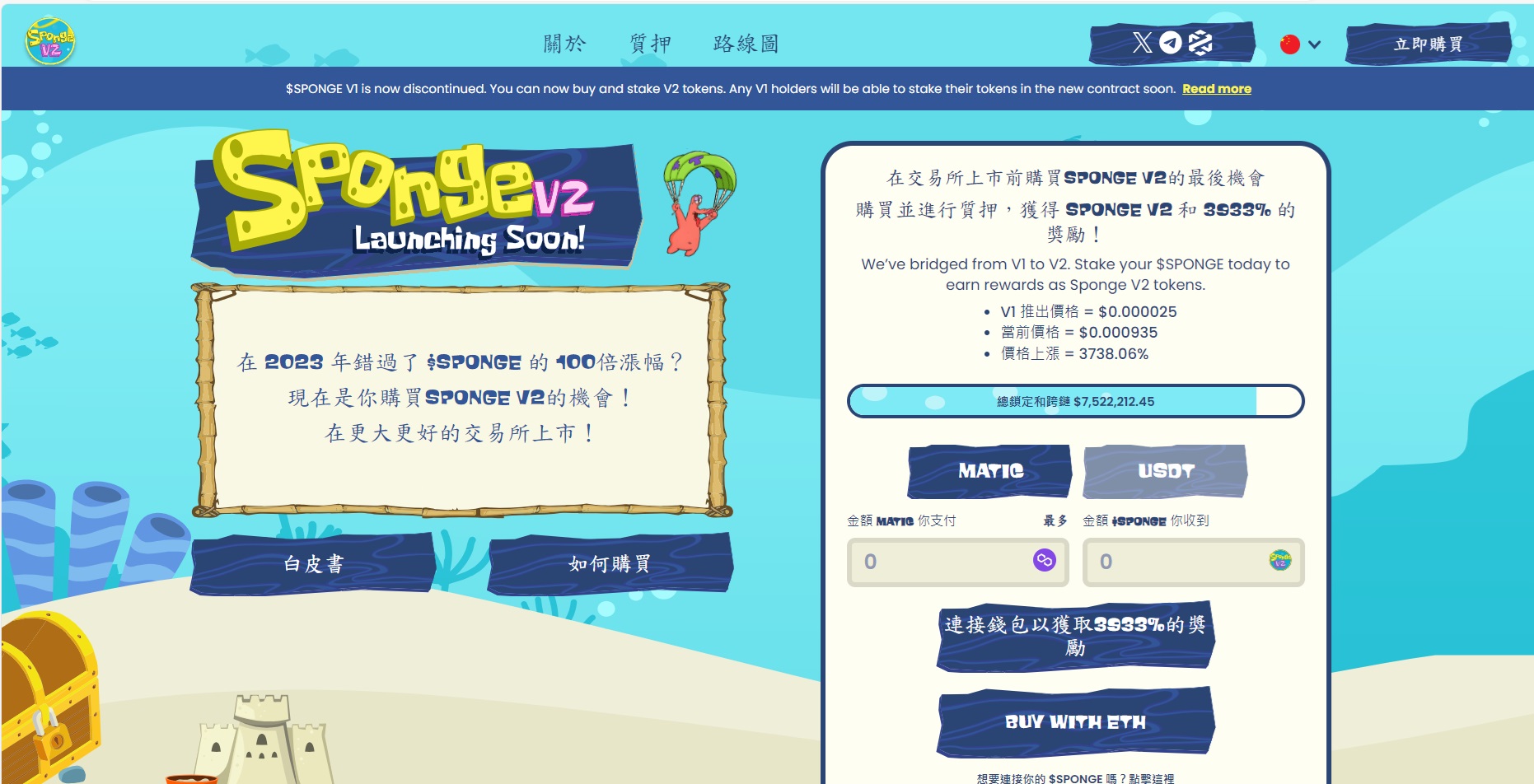 市場都概歎Sponge V1之成功故事將延續至V2之成功,Sponge V1乃2023年最大之模因幣,市值由百萬美金飆升至峰值十億美金,使先行投資者獲得千倍收益,持有者過萬。