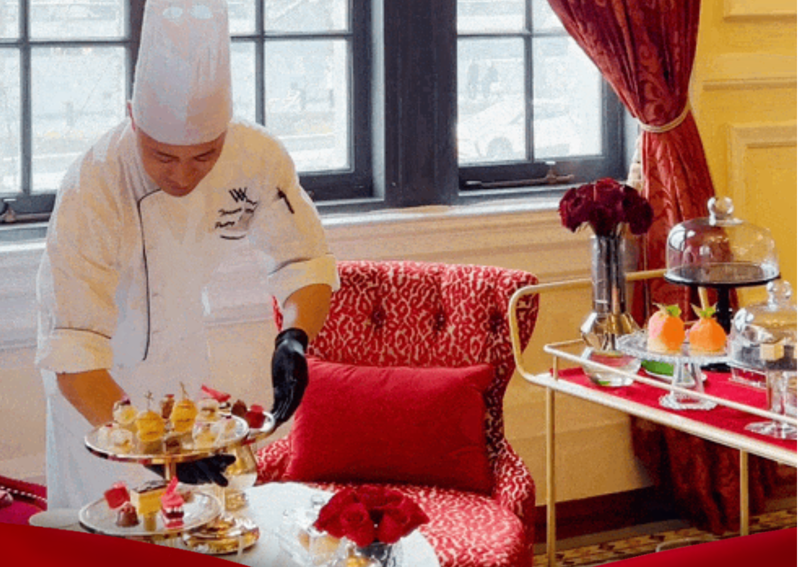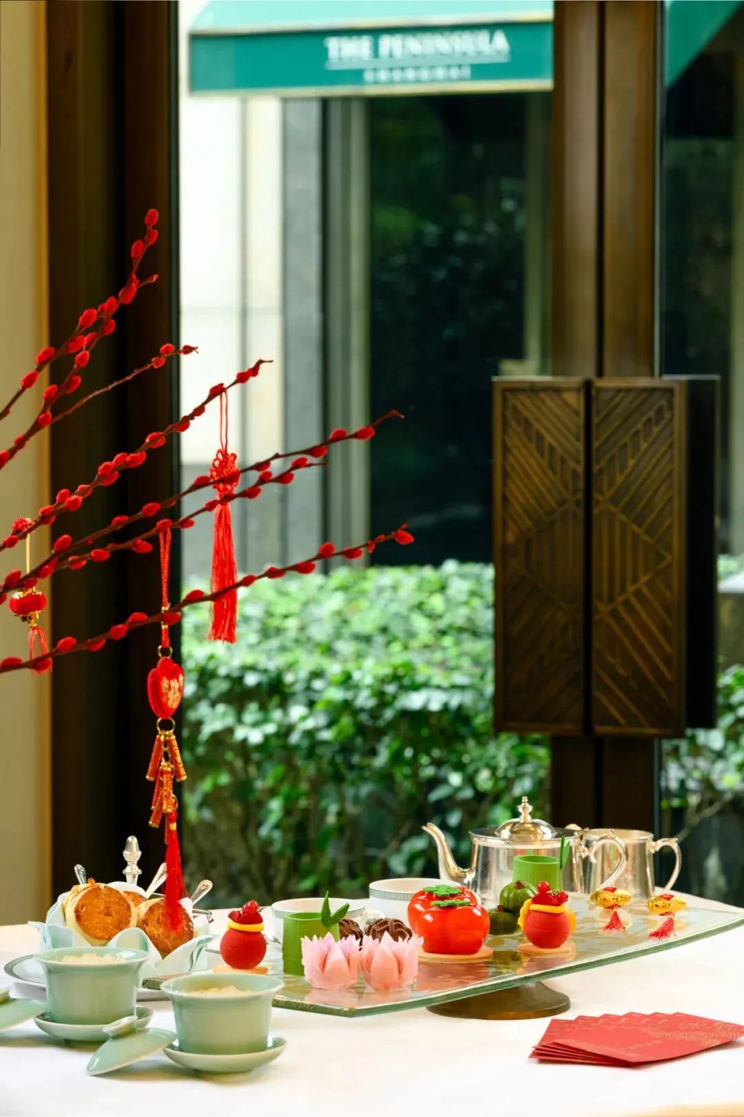 春節期間,飯店推出了新年推車下午茶,送上龍年的第一個舌尖祝福。甜點以哈鬥、西番尼、奶油小方等老上海西點為靈感原型,由西點廚師為你現場製作。備受好評的紅絲絨千層酥蛋糕,融合了層層酥脆的千層餅底,用充滿吉慶的紅色開啟新一年的滿滿福運。