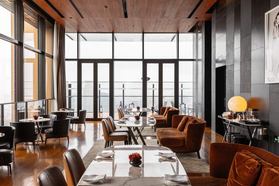 AURA大廳酒廊及爵士吧位於飯店52層,整體設計為沉穩的墨綠色搭配濃鬱的寶藍色,全景玻璃窗,讓魔都迷人的天際線風景變得觸手可及。